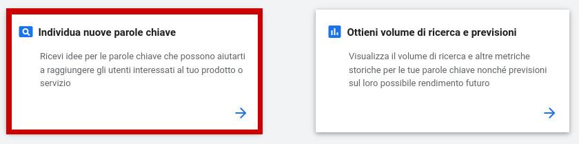 Nella schermata successiva avrai a disposizione 2 scelte: "Scopri nuove parole chiave" e "Ottieni volume di ricerca e previsioni".