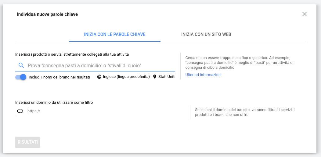 - Inizia con un sito Web: Più orientato agli utenti di Google Ads, può comunque essere utile per trovare nuove parole chiave inerenti la tua homepage o le pagine interne al sito. Anche in questo caso è possibile impostare una lingua ed aree di riferimento.