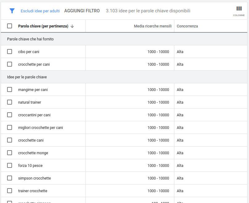 Nel corpo della pagina invece troviamo la funzione piu importante di questo potente strumento e contiene le idee estrapolate relative le tue parole chiave. I risultati sono organizzati in una tabella che puoi visualizzare ed impostare come ritieni opportuno. Nell'esempio visualizzato a seguire abbiamo semplificato la tabella lasciando solo 3 colonne relative le parole suggerite, la media di ricerche mensili e la concorrenza.